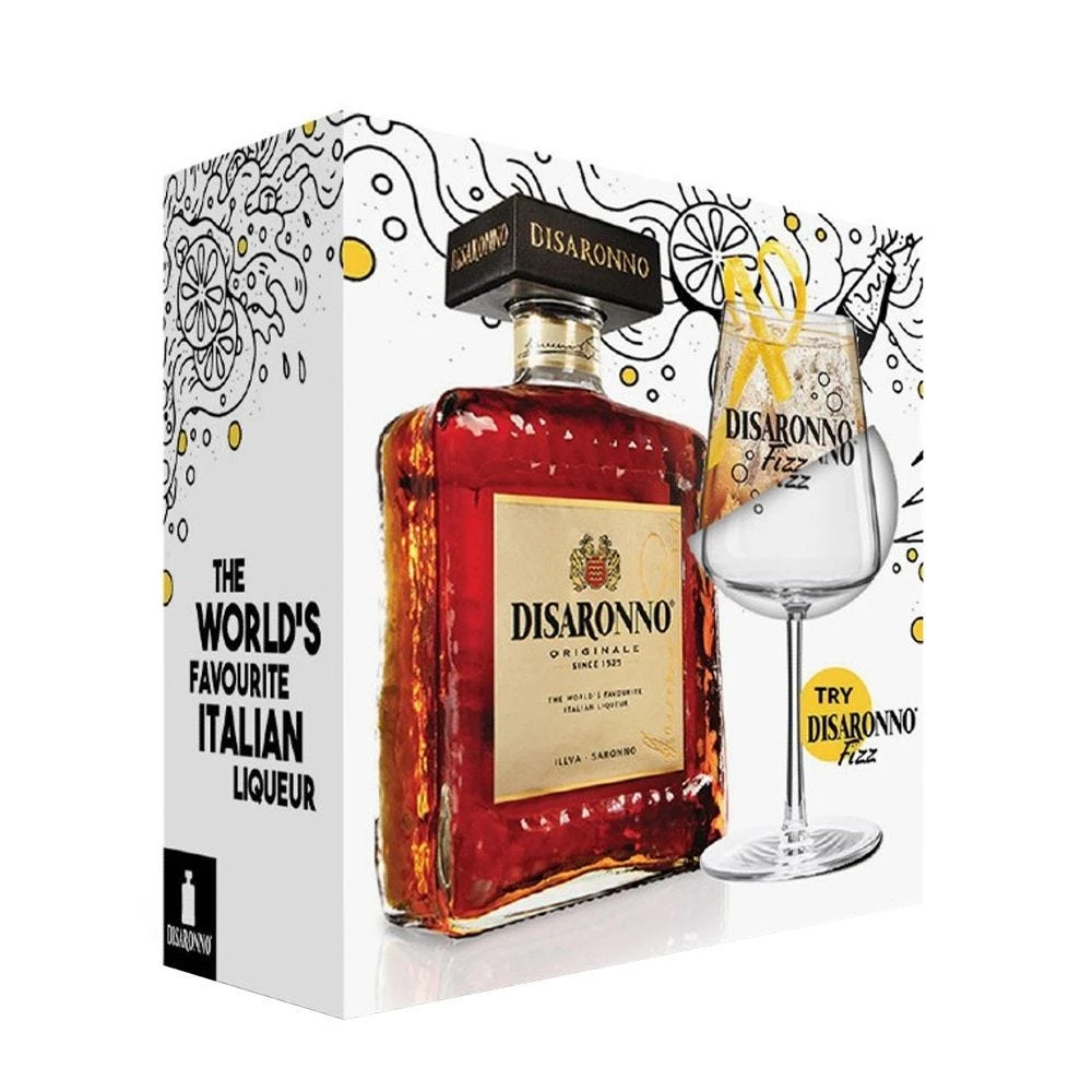 Cool gift pack containing a bottle of Disaronno Liqueur alongside a matchign branded fizz glass. Great for gifting.