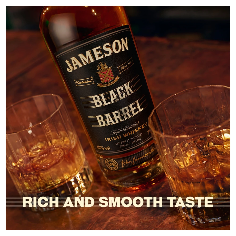 Jameson Black Barrel contains a high proportion of Irish pot still and small batch grain whiskey. Matured in sherry and bourbon casks, the finish is smooth and creamy.